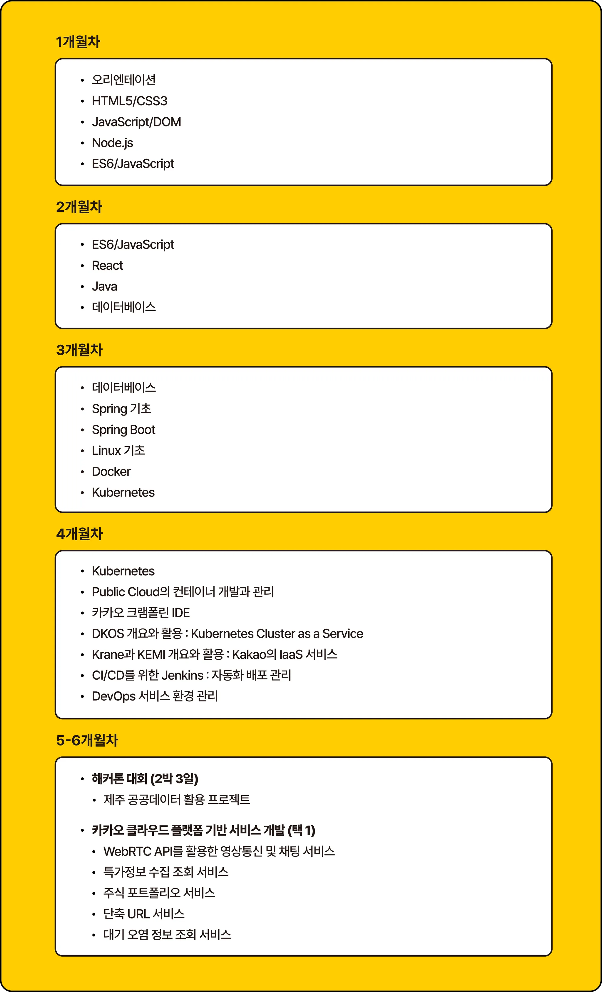 카카오 클라우드 개발자 과정은 클라우드에서 서비스를 구축 및 개발할 때 필요한 요구사항을 이해하고, 이를 위한 환경 구성과 배포 및 모니터링 등의 플랫폼 개발에 대한 내용을 다루고 있습니다.