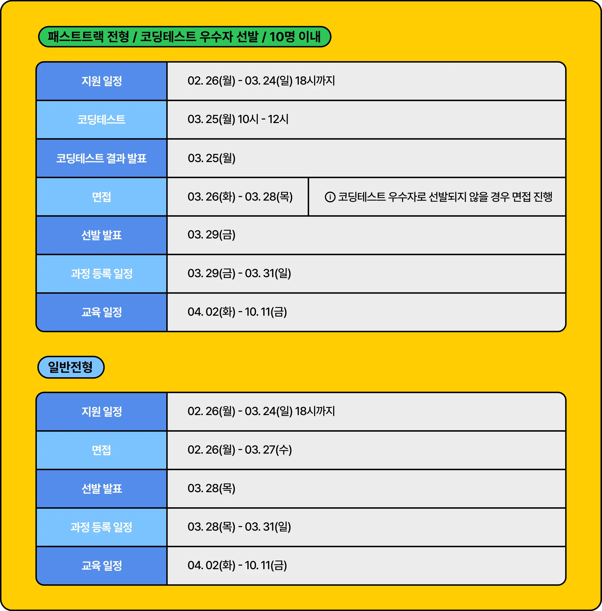 • 코딩 테스트를 통해 우수한 성적을 낸 지원자 최대 10명을 선발하며 이들은 면접 전형을 거치지 않습니다.