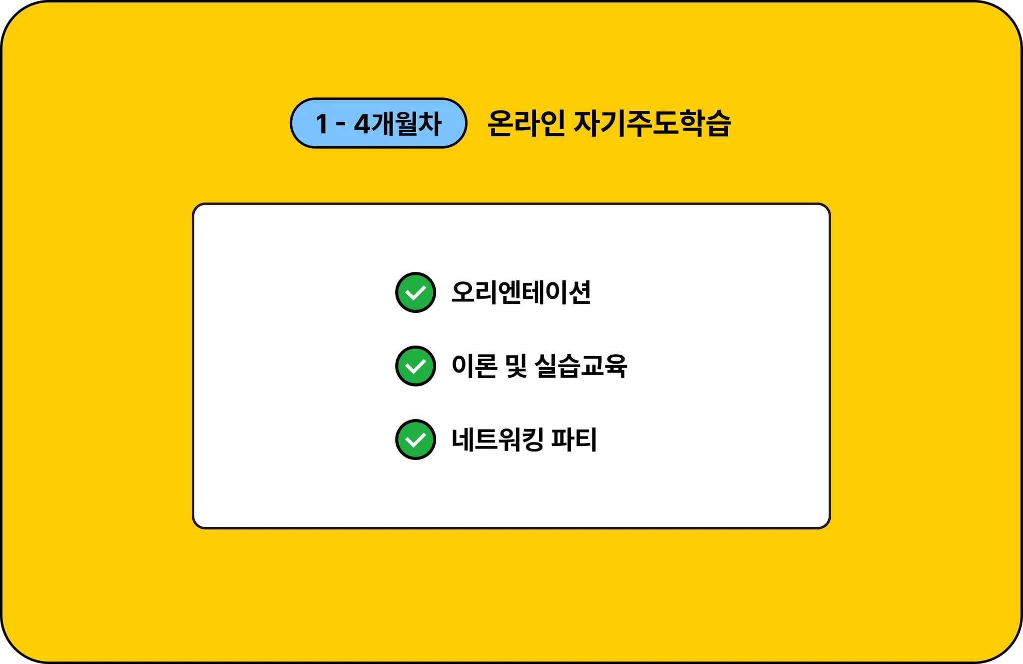 과정 초반 4개월은 학습자 중심의 자기주도학습에 초점을 맞췄습니다. 온라인 강의는 실시간으로 진행되며 메타버스 공간인 구름 유니버스에서 상주하고 있는 멘토의 도움을 받을 수 있습니다. 함께 하는 동기들과 네트워킹을 위해 정기적인 오프라인 행사도 준비했어요.