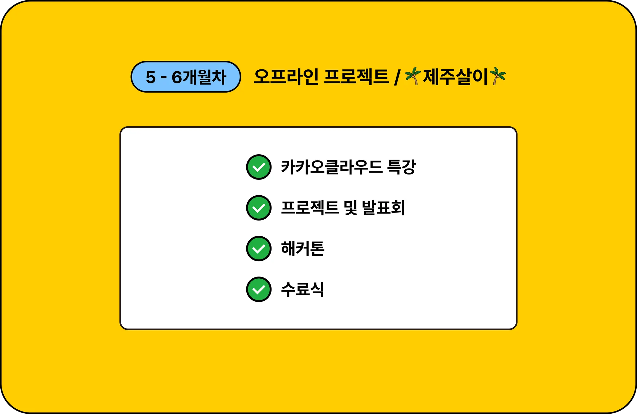 실무형 클라우드 개발자 양성을 목표로 하는 클라우드 스쿨 in JEJU는 한국전파진흥협회와 카카오 그리고 구름이 함께 합니다. 성장의 관성을 지닌 인재를 양성하기 위해 새로운 교육 방식을 도입했습니다. 수료생은 4개월간 실시간 온라인 강의로 자기주도학습 역량을 기르고 이후 2개월간 제주도에서 온전한 몰입을 경험합니다.